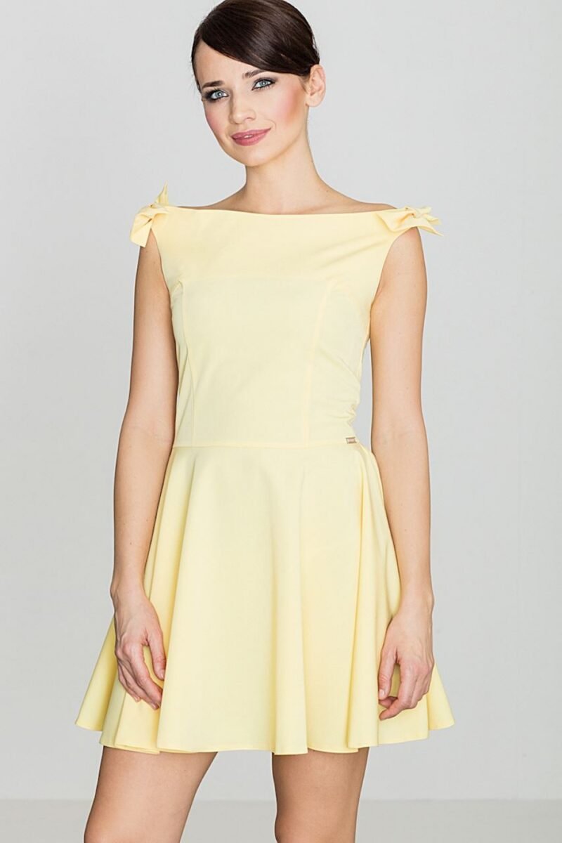 The cut fits the figure perfectly, emphasizing the feminine shapes. The top with a nicely shaped sleeveless neckline, which is replaced by bows on the shoulder giving the dress a charming style.