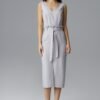 Fitted sleeveless dress, neckline at front and back. There is a ruffle at the waist with a belt, and a split at the front adds chic and elegance.