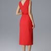Fitted sleeveless dress, neckline at front and back. There is a ruffle at the waist with a belt, and a split at the front adds chic and elegance.