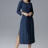 Dress over the knee with 3/4 sleeves, tied at the waist. Delicate topstitching shapes the silhouette nicely. Side slits add chic and elegance.