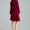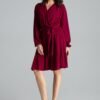 A burgundy midi dress with long sleeves finished with a crease and sewn-in elastic band. Envelope neckline. Skirt with ruffle at the bottom, with sewn in elastic band at waist and additionally a sash for tying.