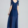 Navy blue long sensual sleeveless dress, tied at the shoulders with a large deep neckline. The upper part of the dress decorated with airy fabric. There is an elastic band sewn into the waist, on the left side there is a slit from the waist. Underneath a partially fitted dress with slightly flared bottom before the knee.