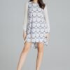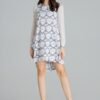 Elegant patterned midi dress with long mesh sleeves with a cuff. The dress has a flared bottom. Longer at the back, and decorative pleats at the waist. Side pockets at the seams, without a fastener.