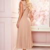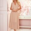 Dress with a neckline and frills. Skirt has a fashionable 7/8 length and is fastened at the back with a covered zipper. Dress in beige. Made by Numoco. Made in Poland.