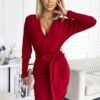Envelope dress with back neckline, long sleeves and waist tie. Made of pleasant to the touch, thicker material. The dress comes in maroon color. Brand numoco. Polish production.