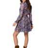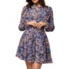 This chiffon mini dress with a fine floral print has maximum appeal. Cut off at the waist with a deep neckline adorned with a tied sash, a wavy skirt with numerous gussets and with long sleeves finished with a crinkle and frill, it will delight during evening outings and will also work well during the day.