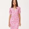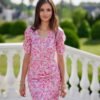 Mini dress with envelope neckline and short sleeves is made of very good quality fabric that will be comfortable to wear. The short dress is characterized by short ruffled sleeves and creases along the torso. The dress is also distinguished by its envelope neckline and overlapping bottom. It also features beautiful patterns that will appeal to everyone. The pre-knee length dress has buffets at the shoulders, which add to the overall character. This model is also characterized by creases along the torso, which optically slims the figure. Fitted dress was created for women who like to attract attention. Matching it with the right accessories, such as jewelry, handbag and shoes, you will create a beautiful evening styling. The product is made and sewn in Poland.