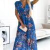 Long chiffon Aria dress with envelope neckline, belt and short sleeves. Dress made of floral fabric on a blue background. Brand numoco. European production.