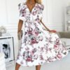 Midi dress with envelope neckline, shoulder ruffles and waist tie. Dress made of white fabric with burgundy roses. Brand numoco. European production.