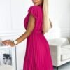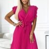 Chiffon dress with neckline, belt and shoulder ruffles. The dress comes in a fuchsia color. Brand numoco. EU production.