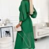 Pleated chiffon dress with neckline, long sleeve and belt. Pleating on the neckline and sleeve adds elegance to the dress. The dress comes in a light green color. Brand numoco.