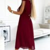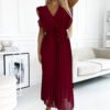 Pleated chiffon midi dress with envelope neckline, shoulder ruffles and belt. Dress made of burgundy colored fabric. Brand numoco. European production.
