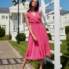The midi length dress on thick straps features an envelope neckline and tapered waist. It zippers up at the back with a delicate back exposure. The overlap neckline will accentuate your slender neck, while the gently exposed back will add a feminine look to your outfit. A perfect choice for a wedding or other formal outing. The product is made and sewn in Poland.