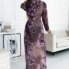Pleated long dress with envelope neckline, long sleeves and wide belt. Made of chiffon fabric on a lining. Pattern: purple large flowers on a brown background. A perfect dress for any occasion. Brand numoco basic. European production.