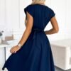 A flared dress with an envelope neckline and a belt. Made of pleasant to the touch material (95% polyester, 5% elastane). Dress in navy blue color. Brand numoco. Polish production.