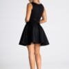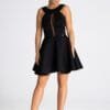 Dress with a fitted top exposing the shoulders. Under the neck, a thrifted neckline with a transparent vertical insert. Wide and flared bottom with marked waist, fastened at the back with a covered zipper.