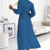 Pleated midi dress with envelope neckline, long sleeves and wide belt. Made of creched fabric in denim color. A perfect dress for any occasion. Brand numoco basic. European production.