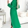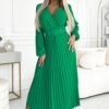Pleated midi dress with envelope neckline, long sleeves and wide belt. Made of creched light green fabric. A perfect dress for any occasion. Brand numoco basic. European production.