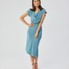 The dress, created with attention to detail, is a unique piece of clothing, designed and sewn in Poland, which testifies to its high quality and local character. Its pencil cut, cut with a slant, gives the overall look a modern and elegant touch. The water-type neckline adds subtlety to the dress, emphasizing the gently exposed chest. Short bat sleeves bring lightness and originality to the styling. The asymmetrical hem of the dress adds character and makes it ideal for various occasions. The midi length gives the dress versatility, allowing it to be worn in both casual and more formal situations. The covered zipper on the side makes it easy to put on and take off the dress, while maintaining its elegant look. The lack of lining means that the fabric sits gently on the body, keeping it light and casual. The dress comes with a belt with buckles, which allows you to accentuate your waist and adjust it to your personal preferences. This is not only a fashionable piece of clothing, but also an expression of support for domestic production and design.