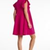 Mini dress with trapeze cut and round neckline. This model has frills at the shoulders which adds to its charm and delicacy.