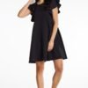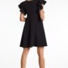 Mini dress with trapeze cut and round neckline. This model has frills at the shoulders which adds to its charm and delicacy.