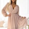 Chiffon midi dress with long sleeves and elegantly finished neckline. The dress comes in beige color. The entire dress is sewn on a lining. Brand numoco. Polish production.
