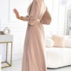 Maxi long dress with a wide belt, a high slit, and a wrap neckline. Made from stretchy material in beige color. European production. Numoco basic brand.