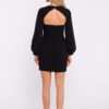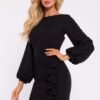 Stylish mini dress sewn from a single-color fabric, ideal for special occasions. Cut off at the waist, it emphasizes the waist, and a flounce sewn on the side adds subtle lightness and feminine charm. The neckline gives the dress elegance, and the cut-out on the back gently exposes the skin, adding a note of sensuality. The dress fastens with a button and a covered zipper reaching halfway down the back for a comfortable fit. Long buffet sleeves finished with cuffs add to its unique character. Unlined model, designed and sewn in Poland.