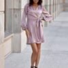 The dress is made of pleasant satin material, which looks extremely elegant. The convertible cut knotted at the waist will work well on many figures and gently conceal minor body flaws. The mini length exposes the legs and guarantees freedom. Long sleeves are gently creased at the shoulders, finished with an elastic band that gives a buff effect. Catlin dress is a model of dress that you can use for many occasions. Properly styled, it will be an excellent choice for more formal events. Combined with pumps and magnificent jewelry, you will create a very elegant and feminine styling. Breaking it with sporty sneakers you will get a more casual, girly look.