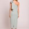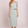 Elegant midi dress in a pencil silhouette, emphasizing the female figure. The model delights with an asymmetrical cut with a motif on one shoulder, adorned with a fancy bow that adds elegance and a unique character. A high slit at the back subtly exposes the leg, giving the creation lightness and sensuality. The dress is fastened on the side with a concealed zipper, ensuring a perfect fit. Partial lining guarantees comfort when wearing. Designed and sewn in Poland with attention to every detail.
