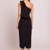 Elegant midi dress in a pencil silhouette, emphasizing the feminine figure. The model enchants with an asymmetric cut with a motif on one shoulder, adorned with a stylish bow that adds elegance and a unique character. A high slit at the back subtly exposes the leg, giving the dress lightness and sensuality. The dress is fastened on the side with a concealed zipper, ensuring a perfect fit. The partial lining guarantees comfort when wearing. Designed and made in Poland with attention to every detail.