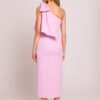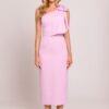 Elegant midi dress in a pencil silhouette, emphasizing the feminine figure. The model impresses with an asymmetrical cut with a motif on one shoulder, decorated with a fancy bow that adds chic and unique character. The high slit at the back subtly exposes the leg, giving the outfit lightness and sensuality. The dress is fastened on the side with a hidden zipper, ensuring a perfect fit. The partial lining guarantees comfort when wearing. Designed and made in Poland with attention to every detail.
