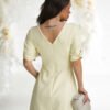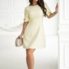 Stylish dress in a powder pink shade with an A-line cut that subtly emphasizes the silhouette. Decorative, short sleeves with cutouts add lightness and a unique character. Lining provides comfort when wearing. Perfect for any occasion! Made of high-quality material that beautifully drapes on the silhouette. The dress is fastened with a hidden zipper.