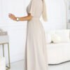 Subtle, feminine, and extremely elegant, the beige maxi dress made of light chiffon is a perfect choice for many occasions. It will work perfectly for a wedding, communion, baptism, family gatherings, romantic dinner, and even as a bridesmaid dress. The wrap neckline beautifully accentuates the bust, and the waist tie optically shapes the silhouette and accentuates the waist. Airy sleeves and a flared bottom add lightness and class to the whole look. The beige color adds chic and fits many types of beauty.