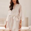 Beatrice dress in a trapeze cut and knee-length, made of lightweight and breathable Lyocell. The model features a V-neck with a low stand-up collar and ties. 3/4 sleeves finished with a double flounce give the whole lightness. The dress can be worn loosely or tied at the waist with a wide belt made of the same material, allowing for a perfect fit to any silhouette.