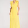 Maxi dress with a wrap neckline and decorative, double ruffles on the shoulders. Elastic band and fabric belt for tying at the waist. The bottom is long, with small pleats, made of lightweight, semi-transparent fabric.