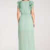 Maxi dress with a wrap neckline and decorative, double ruffles on the shoulders. Elastic band and fabric belt for tying at the waist. Long bottom with small pleats, made of lightweight, semi-transparent fabric.