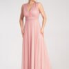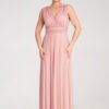 Maxi dress without sleeves with a wrap neckline at the front and a deep cut at the back. The top is gently gathered, with a wide band under the bust. The back is tied in a bow.