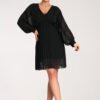 Mini dress with a kimono-style top. Model with a long chiffon sleeve fastened with two buttons. Loose, pleated and slightly flared bottom. Viscose lining.