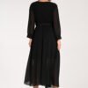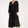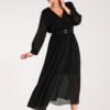 Maxi dress with pleated, wrap neckline. Long sleeve with cuff, belt at the waist.