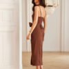 The Maribel dress is an elegant midi model with thin straps that subtly reveal the shoulders and back. The loosely falling, simple neckline adds class to it, and the slit on the leg and draping in the upper part of the skirt emphasize the feminine character of the styling. The whole is complemented by a decorative rose, a multifunctional accent that you can wear in various ways: at the waist, on the neck, on the wrist, or as an addition to a handbag. The dress is fastened at the back with a concealed zipper. The Maribel model delights with its form and does not require many accessories to attract attention. The carefully designed cut beautifully emphasizes the silhouette, creating an elegant and bold styling. Paired with minimalist footwear, such as subdued sandals or classic pumps, it will be perfect for special occasions such as weddings, birthdays, bachelorette parties, or a night out at the club.