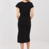 Stylish pencil dress, perfect for parties or special occasions. Made of a comfortable blend of polyester and viscose, which beautifully drapes on the silhouette, providing lightness and elegance. The dress has a smooth pattern, a round neckline, and short sleeves, and decorative draping on the front subtly shapes the silhouette, adding character. The slit at the bottom reaching the thighs introduces a delicate, sensual accent, and the midi length emphasizes the elegance of the outfit. The lack of fastening makes the dress easy to put on, and the classic pencil cut perfectly highlights the feminine silhouette. This is a proposal for women who appreciate chic, comfort, and subtle sensuality in one.