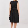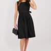 Elegant formal dress designed for special occasions and stylish night outs. The flared cut beautifully emphasizes the waist and adds lightness to the silhouette, while the knee-length adds class and timeless elegance. Made of high-quality polyester and viscose blend, which ensures comfort and perfect fabric draping. The varied texture of the fabric gives the whole outfit an original character and subtle depth. Sleeveless dress with a classic round neckline looks extremely chic. Cinched at the waist, with decorative pleats, beautifully shapes the silhouette and emphasizes feminine curves. The set includes a fastened belt, which additionally accentuates the waist, and a detachable flower-shaped brooch, allowing you to adjust the outfit to the occasion. It is a perfect choice for receptions, family celebrations, and elegant meetings when you want to look exceptionally classy.