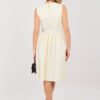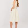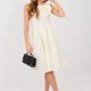 Elegant cocktail dress created for special occasions and stylish party outings. The flared cut beautifully emphasizes the waist and gives the silhouette lightness, while the knee-length adds class and timeless elegance. The model is made of high-quality polyester and viscose blend, which ensures comfort and excellent material drape. The varied texture of the fabric gives the whole original character and subtle depth. The sleeveless dress, with a classic round neckline, looks extremely chic. Cinched at the waist, with decorative pleats, it beautifully shapes the silhouette and accentuates feminine curves. The set includes a fastened belt, which additionally emphasizes the waist, and a detachable flower-shaped brooch, allowing you to match the outfit to the occasion. It is a perfect choice for receptions, family celebrations, and elegant meetings when you want to look exceptional and classy.