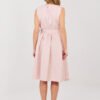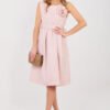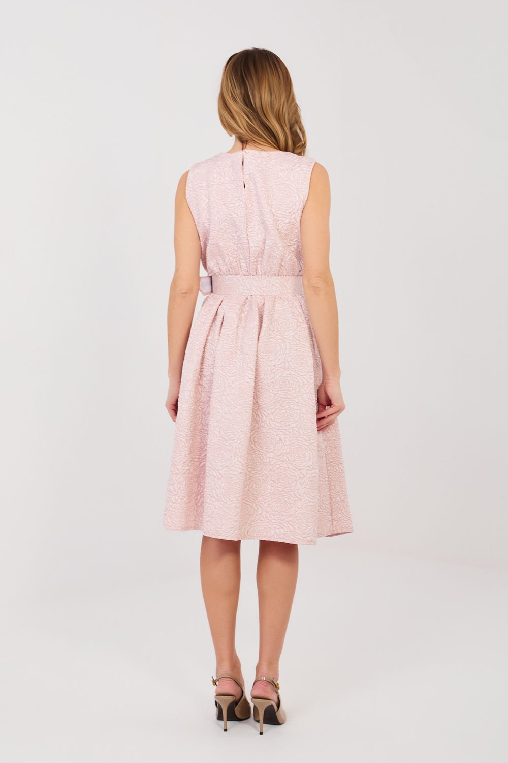 Elegant cocktail dress created for special occasions and stylish outings. The flared cut beautifully emphasizes the waist and gives the silhouette lightness, while the knee-length adds class and timeless elegance. The model is made of high-quality polyester and viscose blend, which ensures comfort and perfect fabric draping. The varied texture of the fabric gives the whole a unique character and subtle depth. The sleeveless dress, with a classic round neckline, looks extremely elegant. Cinched at the waist, with decorative pleats, it beautifully shapes the silhouette and accentuates feminine curves. The set includes a fastened belt, which further accentuates the waist, and a detachable flower-shaped brooch, allowing you to customize the outfit for the occasion. This is an excellent choice for receptions, family celebrations, and elegant meetings when you want to look exceptionally classy.