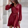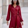 Dress made of soft, satin material, which gives it an exceptionally elegant character. The wrap-around style with a tie at the waist beautifully accentuates the silhouette, subtly masking minor imperfections. Mini length showcases the legs and provides freedom of movement. Long sleeves, slightly wrinkled at the shoulders and finished with an elastic band, create impressive puffs. The Catlin model is a dress that will work for many occasions. Styled elegantly with heels and statement jewelry, it will be perfect for formal events. On the other hand, paired with sporty sneakers, it gains a casual, girly character. The dress is designed and made in Poland.