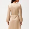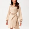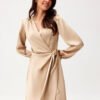 Dress made of soft, satin material that gives it an exceptionally elegant character. The wrap-around style with a tie at the waist beautifully accentuates the silhouette, subtly masking minor imperfections. The mini length showcases the legs and provides freedom of movement. Long sleeves, slightly ruched at the shoulders and finished with elastic, create impressive puffs. The Catlin model is a dress that will work for many occasions. Styled elegantly with heels and statement jewelry, it will be perfect for formal events. On the other hand, paired with sporty sneakers, it gains a casual, girly character. The dress is designed and made in Poland.