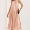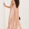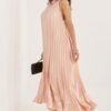 Pleated cocktail dress is an elegant proposal that will work perfectly for special occasions and parties. Its light, airy midi length silhouette beautifully flows with movement, emphasizing the feminine figure and adding a subtle lightness to the styling. The sleeveless model with a classic, round neckline looks timeless and classy. An original accent is the tie on the left shoulder, which gives the dress a unique character and attracts attention. The bottom finished with a delicate ruffle adds a romantic charm and lightness to the whole look. The smooth material, a combination of polyester, viscose, and elastane, provides comfort, proper fit, and freedom of movement. This is the perfect dress for visits and parties for women who appreciate elegance in a modern version.