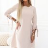 Are you looking for a styling in which you will feel confident at an important event? This elegant beige dress ALICE will work for a family gathering, dinner or at work when you want to look classic and neat. The smooth form and light shade beautifully emphasize accessories, from high heels to delicate jewelry. The model has a round neckline and 3/4 sleeves finished with a bow tie. The cut is cinched at the waist with a belt to tie, and the bottom slightly flares, making the silhouette look proportionate. The knee-length adds lightness and works well both for everyday wear and for bigger occasions. Made in Poland.