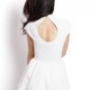 The minimalistic cut makes the dress suitable for various occasions depending on accessories. The top of the dress is fitted, the bottom is flared with two different length frills. The neckline is a low stand-up collar. At the back decorative teardrop, subtly exposing the line of the back.